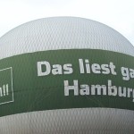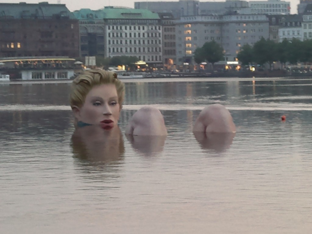 Die 4m große Figur aus Styropor ist seit dem 2. August in der Binnenalster nahe des Jungfernstieges und der Europa Passage zu bewundern. Über dem Wasserspiegel sind nur der Kopf und die Knie zu sehen, die Dame sitzt also wie in einer riesigen Badewanne im Wasser.